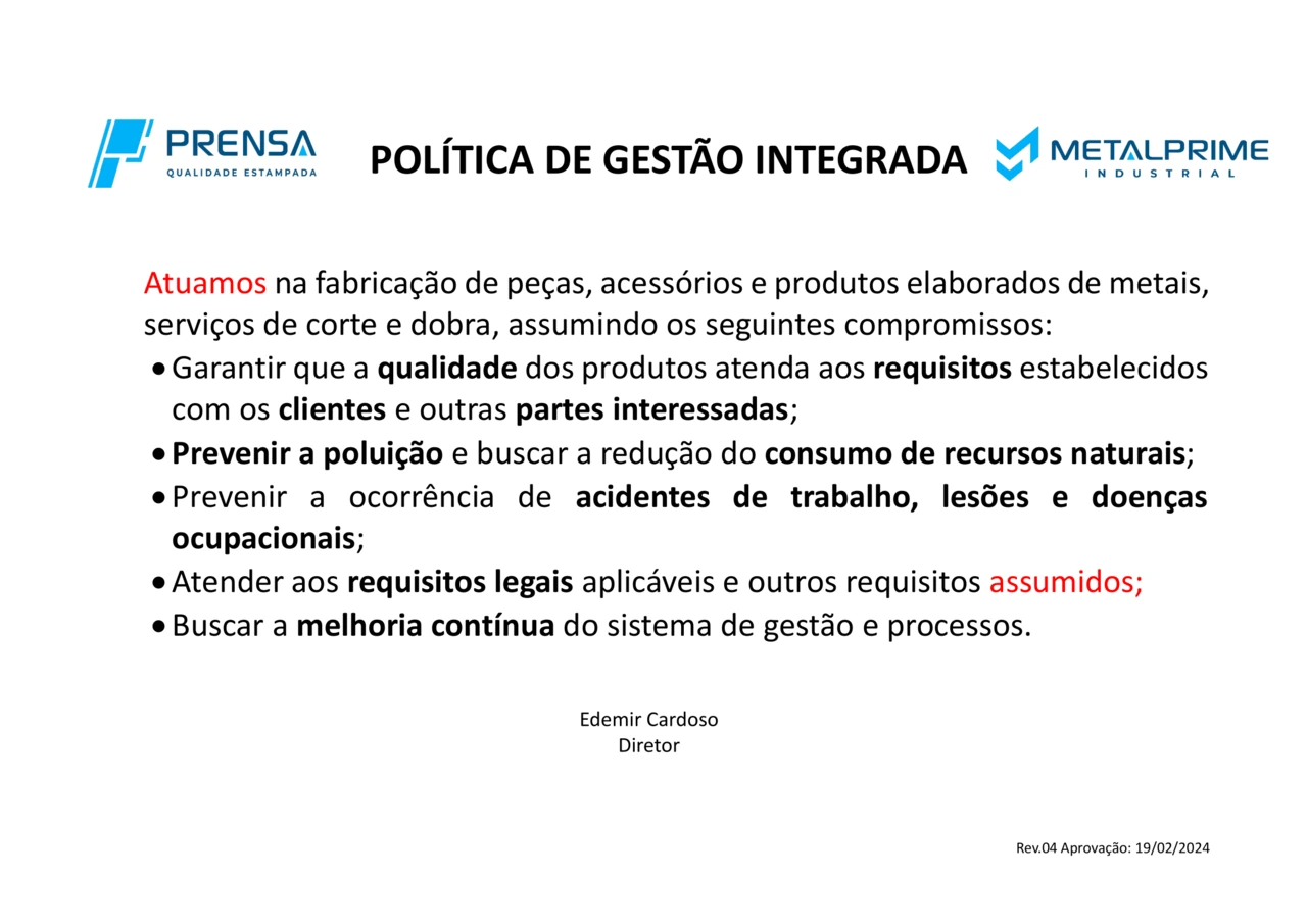 Desde então, conduz o gerenciamento estratégico e gestão operacional de processos internos, incluindo definições de como atende aos requisitos de clientes e outras partes interessadas, além das diretrizes das normas NBR ISO 9001, NBR ISO 14001 e NBR ISO 45001, expressando os compromissos de toda a organização, através da Política de Gestão Integrada, que em conjunto com todos os demais documentos, compõem o Sistema de Gestão Integrada, implantado em mantido.